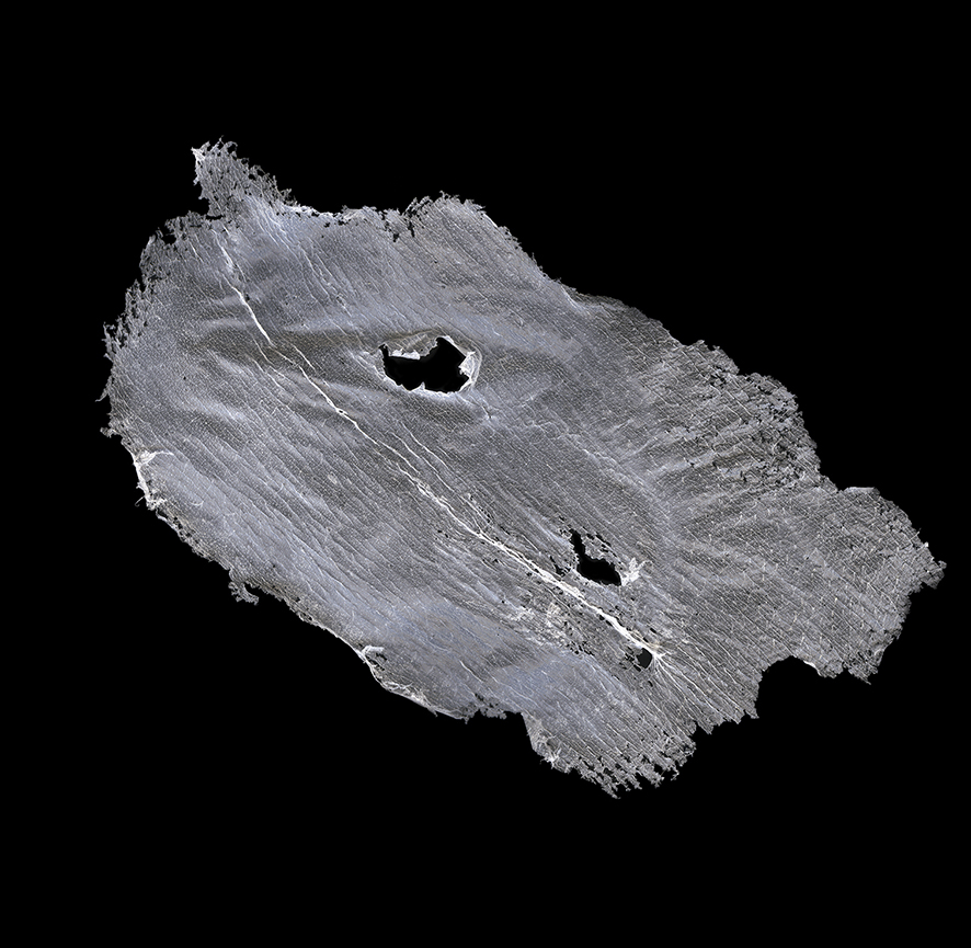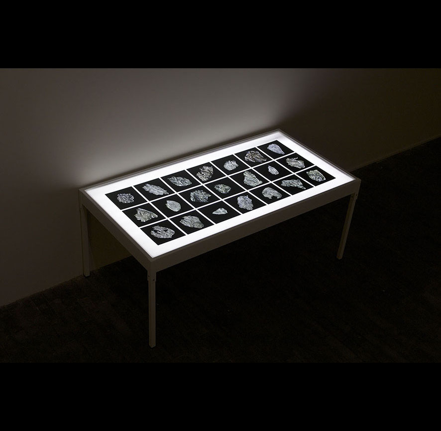 En torno a la Piel. Ejercicio #1: Rastros o indicios es entonces una serie de rastros de piel acomodados en un solo políptico de 21 fragmentos (3 x7) impreso en película duratrans (208 x 103 cm ) y montada en una caja de luz (aluminio blanco 100 cm de alto), como una mesa de observación para hacer referencia a las mesas de disección.