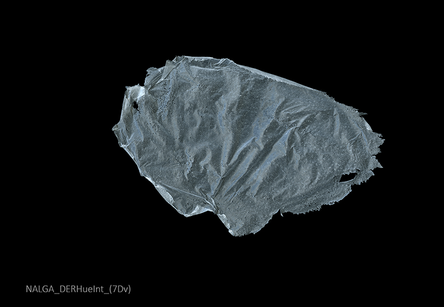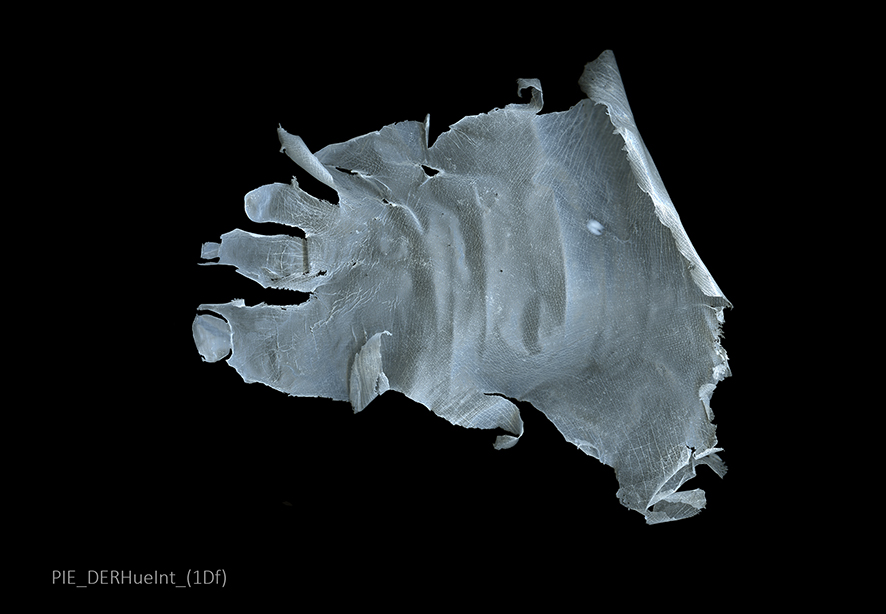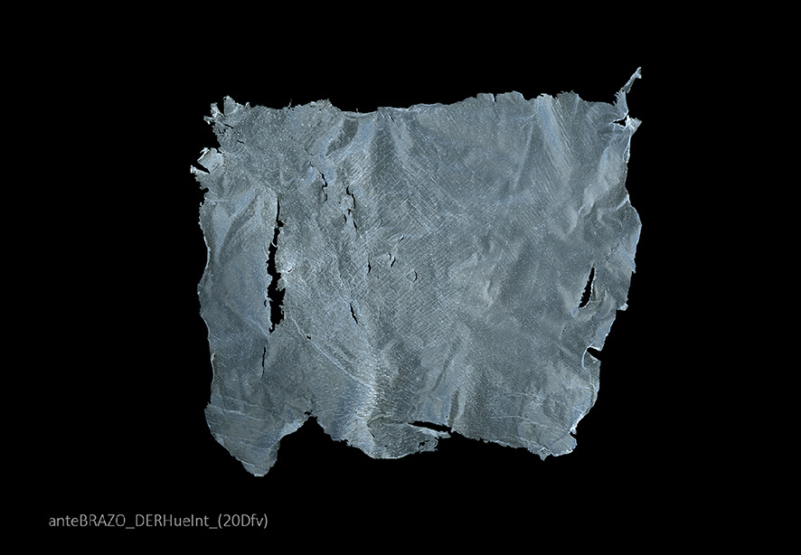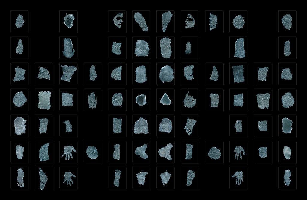 Esta pieza está conformada por la cara interna de los rastros. Cada fragmento tiene distinta forma y tamaño, son rastros, en el sentido literal de la técnica, una huella con líneas, volumen, sobras y luces, y a su vez un vestigio, una memoria, un resto que queda; indicios de que algo existió. Las células de la piel que mueren todo el tiempo, la piel que muta todo el tiempo, los rastros son vestigios de una piel que está en proceso de transformación, un cuerpo que es un devenir constante.