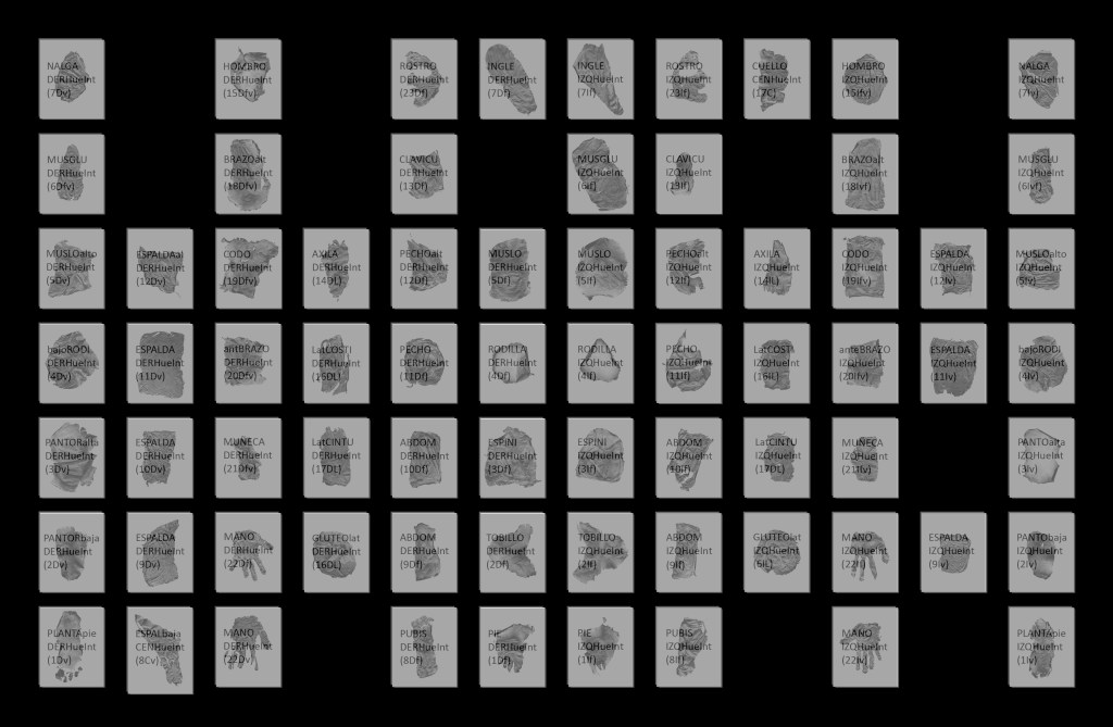 Inventario de un cuerpo vacío #1 consiste en un total de 72 rastros del registro de un cuerpo completo. Cada imagen representa el fragmento del cuerpo que le corresponde (1:1), y la suma de todos los fragmentos o rastros, la piel completa de este cuerpo.